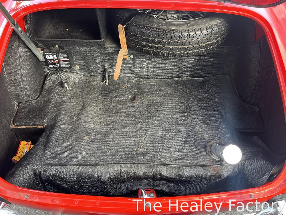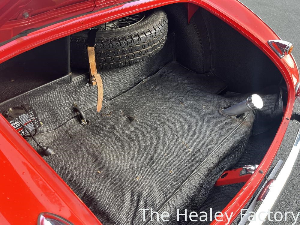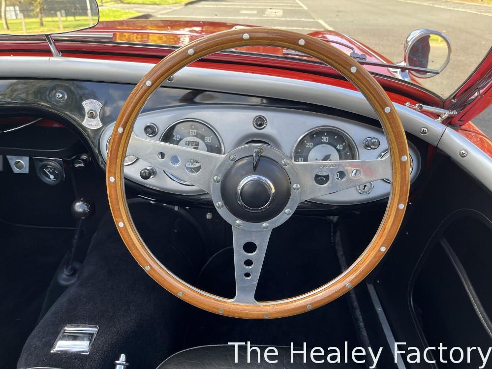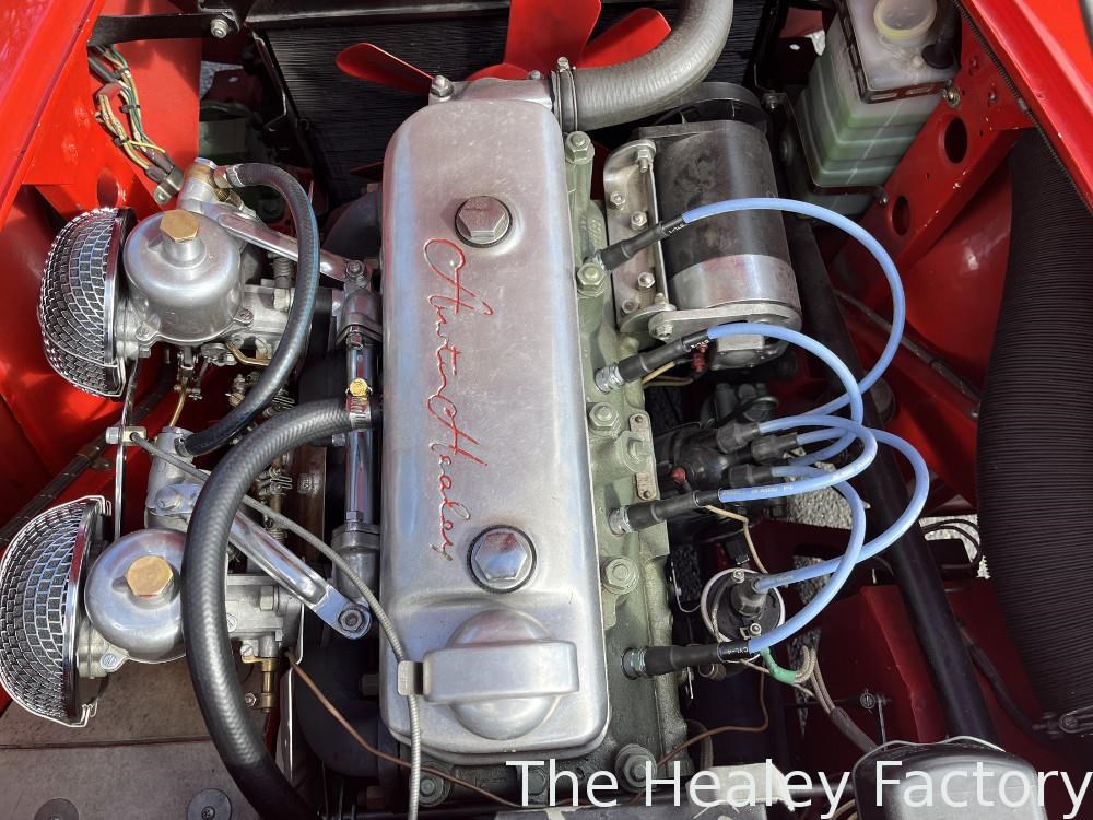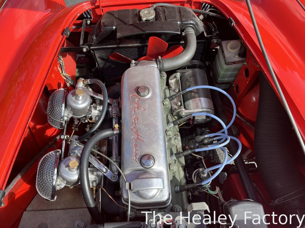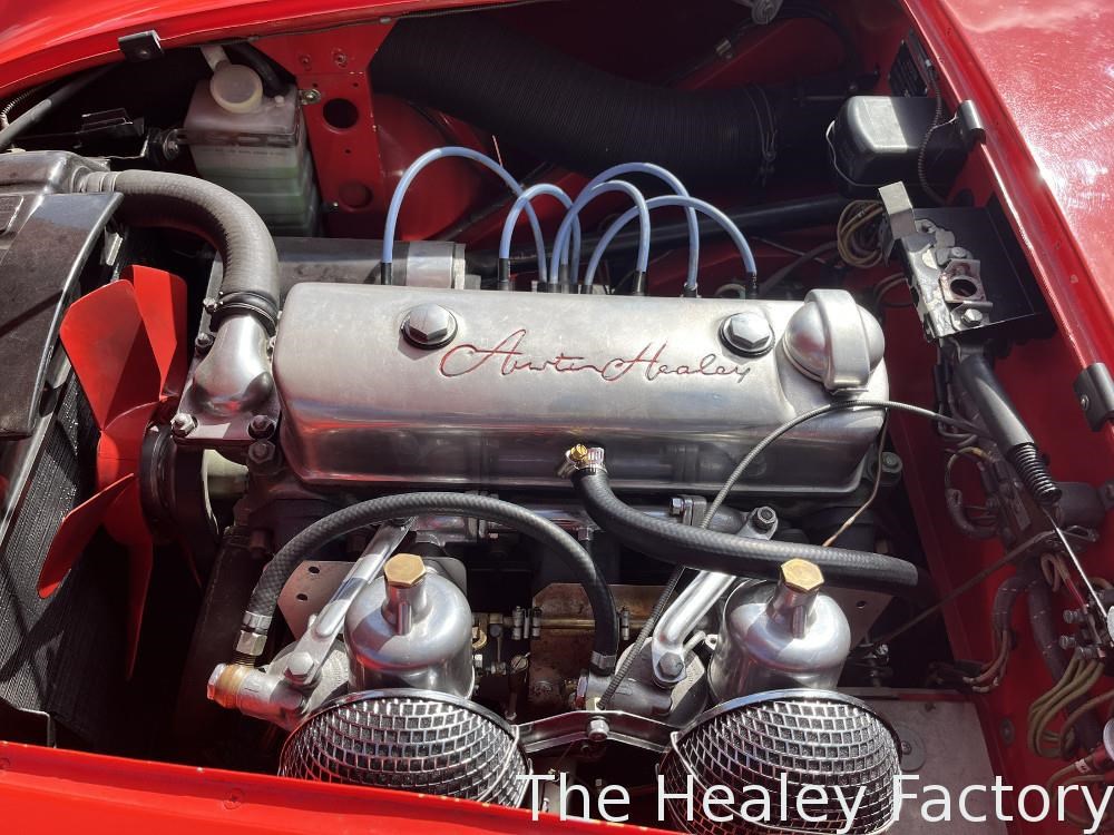 The Healey is largely mechanically standard with small under bonnet improvements consisting of an alloy script rocker cover and Texas Kooler fan. In addition, a new aluminium fuel tank has been fitted. The exterior benefits from a rear indicator conversion in place of the original reflectors as well as mesh guards over the head and driving lamps.