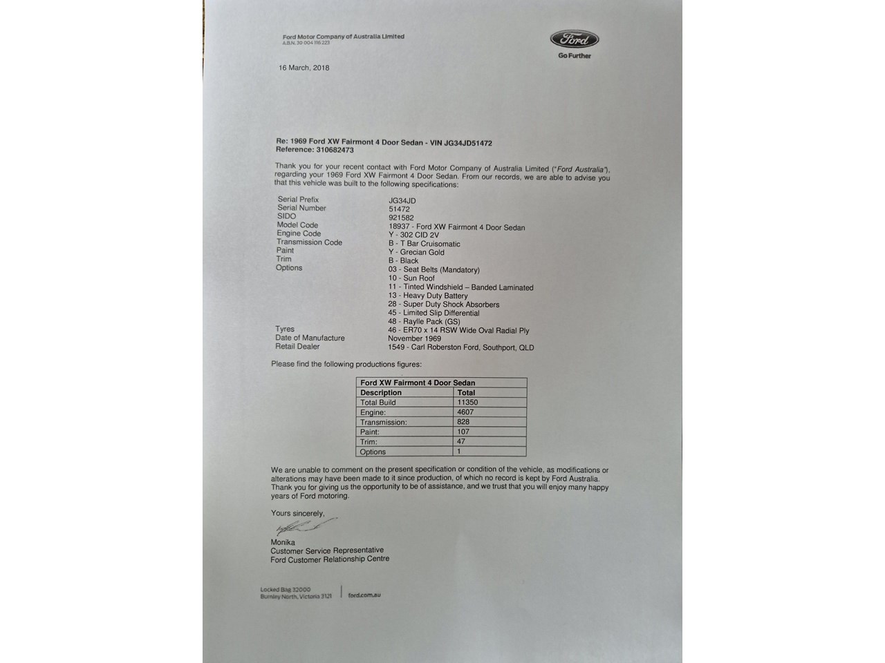 Price: $124,990 VIN: JG34JD51472 Engine: Y - 302 CID 2V Windsor V8 Transmission: B - T-Bar Cruisomatic Paint: Y - Grecian Gold Trim: B - Black Options: 03 - Seat Belts 10 - GOLDE Sunroof 11 - Laminated Tinted Banded Windshield 13 - Heavy Duty Battery 28 - Super Duty Shock Absorbers 45 - Limited Slip Differential 48 - GS Rallye Pack Build: November, 1969 Selling Dealership: 1549 - Carl Robertson Ford, Southport, QLD