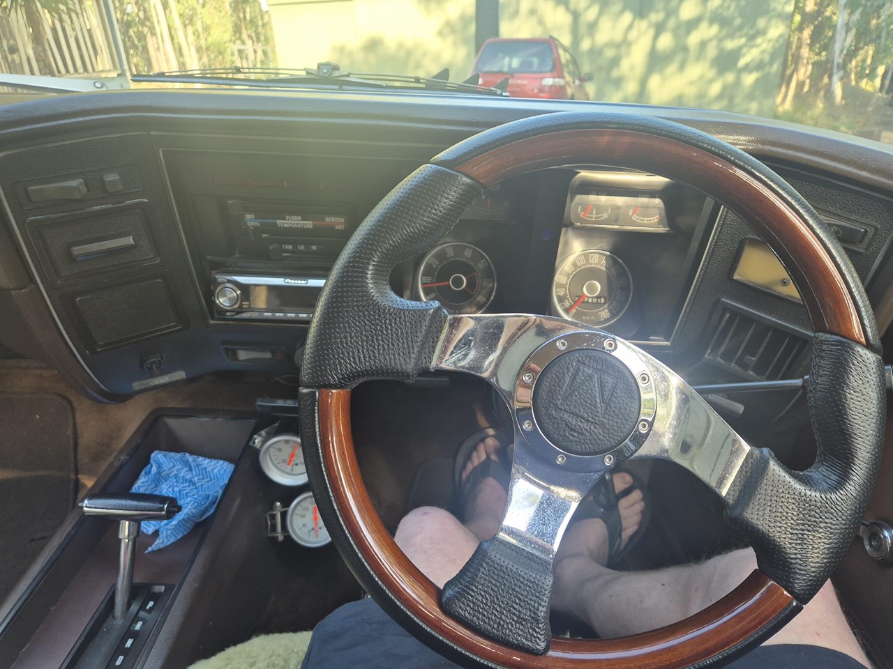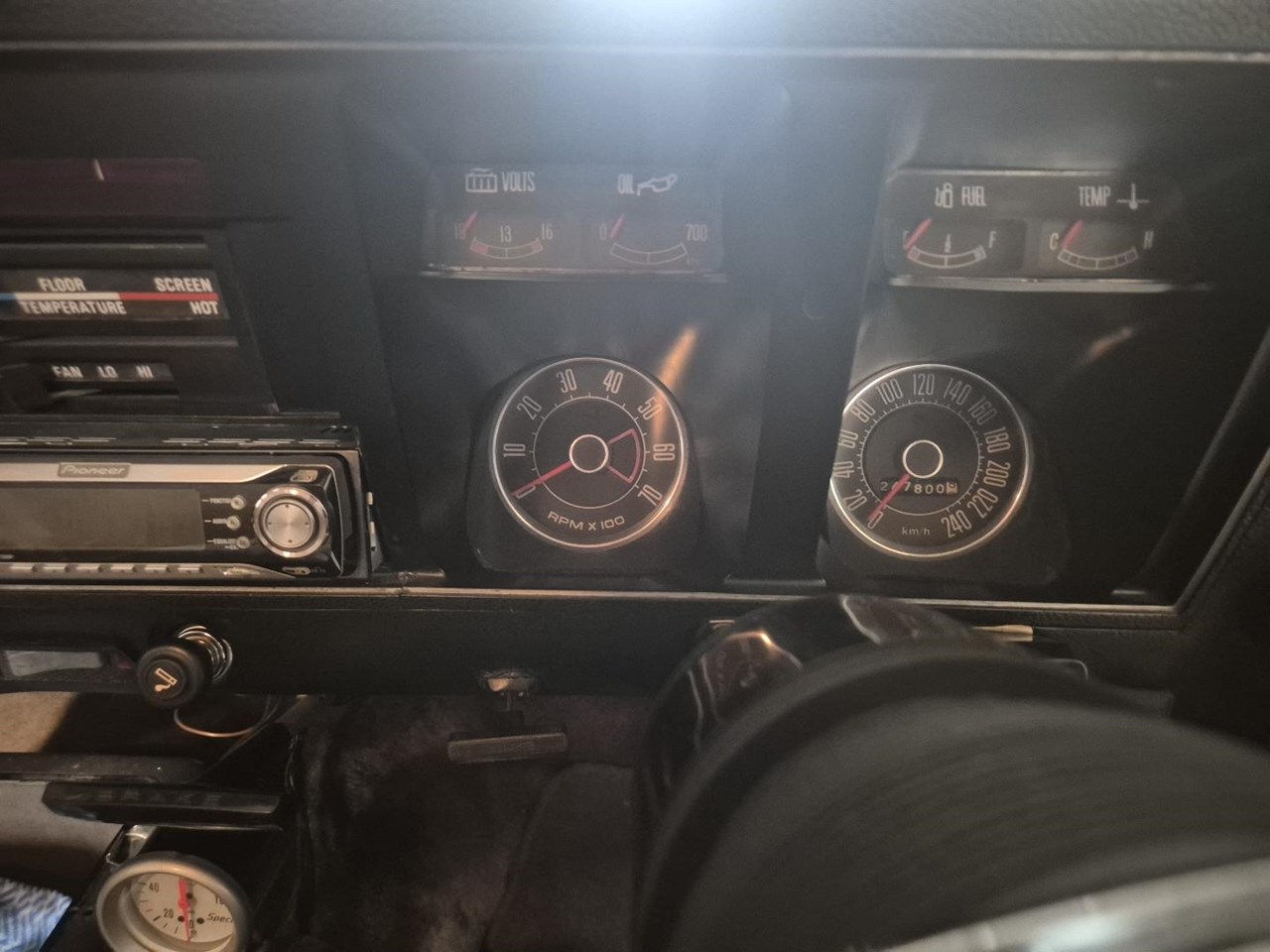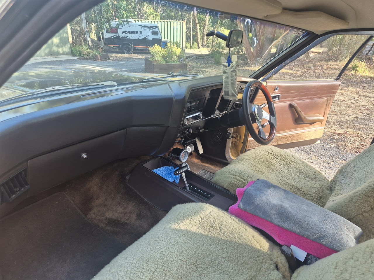 The interior is day one original and the front seats have been covered with sheep skin covers for the past 36 years resulting in the perfect condition of the original factory saddle seats. The original dash, gauges, steering wheel are all present and accounted for. The GT is currently fitted with a SAAS sports steering wheel. The Falcon has been fitted with a Pioneer AM/FM/CD player and factory power steering. The GT is showing 247,800 Kilometres from new.