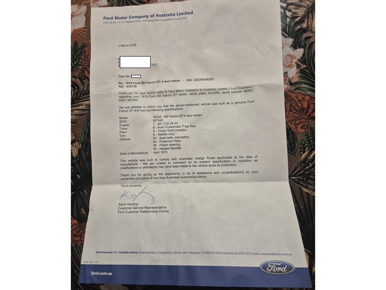 For sale an original maintained Tropic Gold 1975 Ford Falcon XB GT running the matching numbers 351 Cleveland V8 and factory FMX 3 speed automatic gearbox. Owned for the past 36 years, its now time for the next custodian of this well maintained GT Falcon. For your inspection from Ballarat, Victoria.